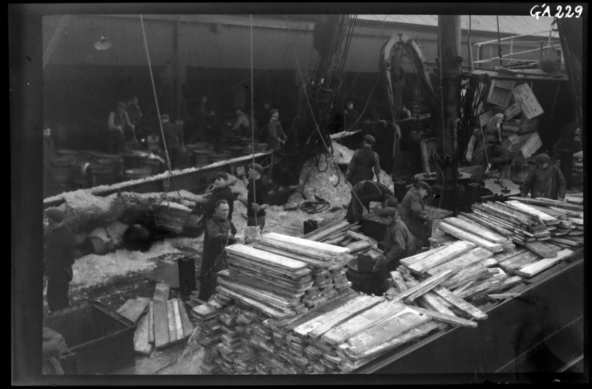Löndun úr togara, sem liggur við kæja eða bryggju en í bakgrunni löng bygging, opin að neðan. Á bryggjunni mannskapur, tunnur. Togarinn sést einkum bakborðsmegin, yfir þilfarið, sem á eru menn að störfum. Staflar af stíuborðum, kassahrúga við hvalbak, ís, tágakarfa hangir í gilsvír og heldur þéttvaxinn maður í.