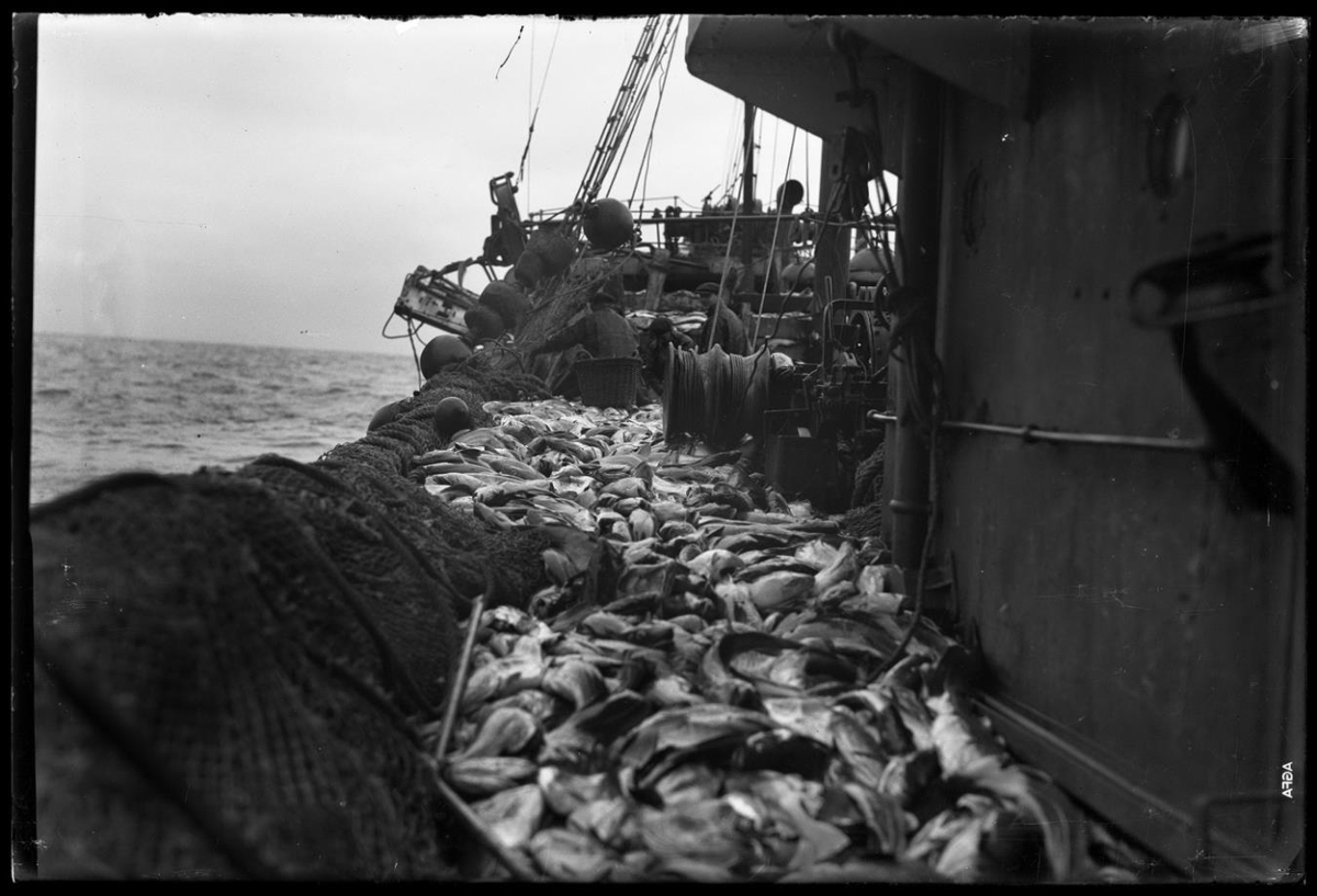 Um borð í togara. Sér fram eftir skipinu bakborðsmegin, undir brúarvæng að hvalbak. Mikill fiskur á dekki. Trollið liggur á borðstokknum. Toghleri í gálga, tágakarfa. Þrír menn á sjóklæðum. Bakgrunnur yfirlýstur (enginn).