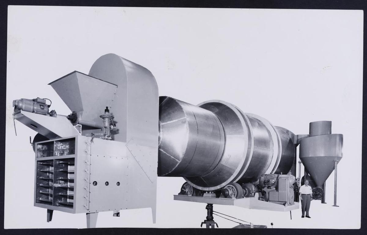 Gísli Halldórsson verkfræðingur í heimsókn. Undir myndinni stendur: Þurrkari