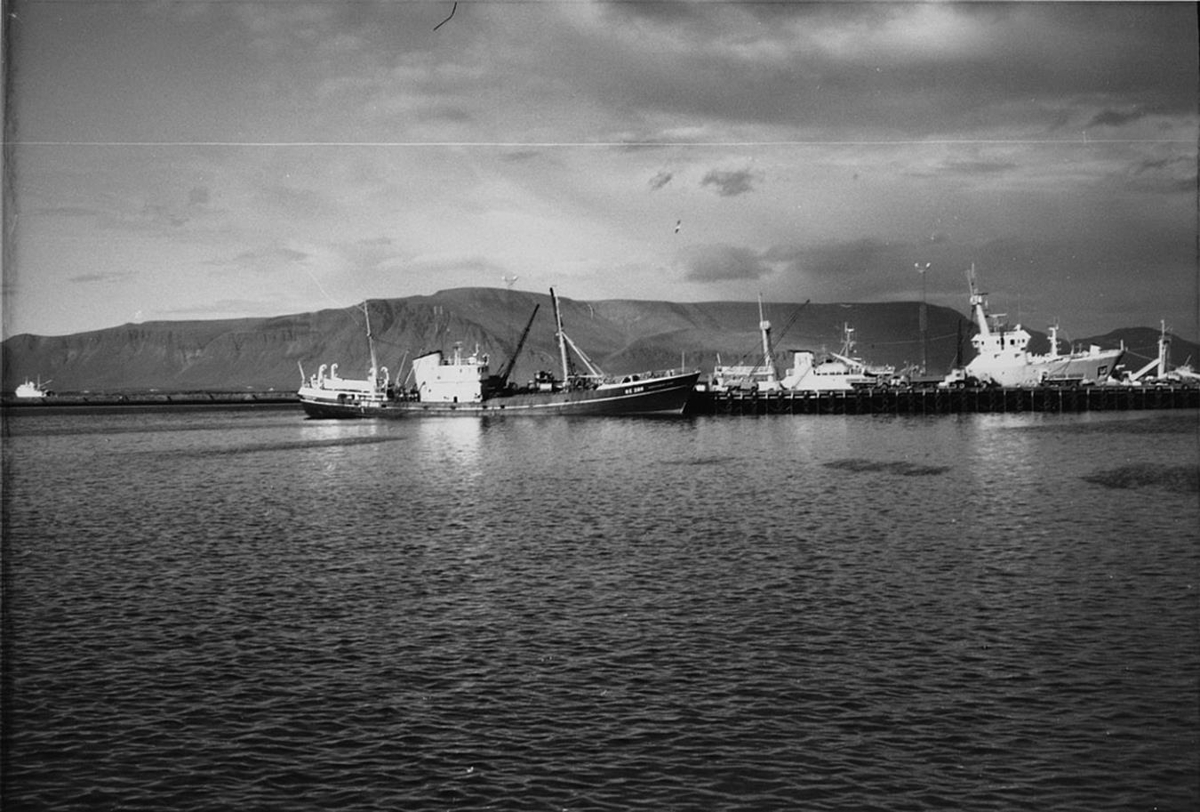 Stór síðutogari liggur við bryggju í baksýn. Á kinnungnum eru stafirnir: RE 209. Handan bryggjunnar eru fleiri skip, fjall í bakgrunni.