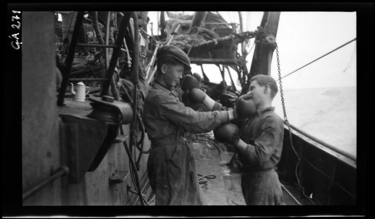 Tveir ungir piltar í hnefaleikum um borð í togara. Tekið bakborðsmegin á móts við keis og sér aftur eftir skipinu. Ljós kaffikanna stendur á keis á móts við blökk. Annar á samfestingi og með derhúfu. Hinn berhöfðaður á skyrtu og buxum.