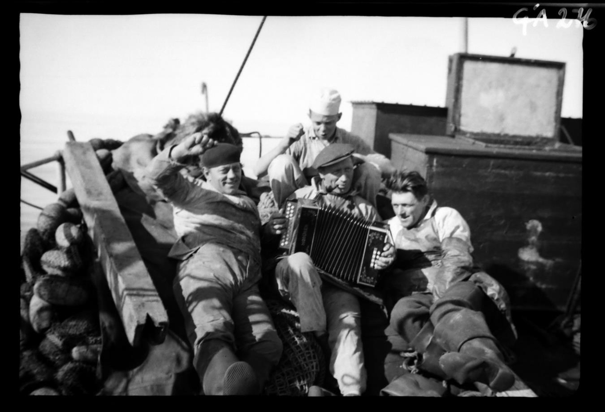 Fjórir menn liggja eða sitja þétt saman á nót. Sá í miðið heldur á harmonikku og reykir pípu. Aftan við hann maður með kokkahúfu. Einn maður með alpahúfu. Klæðnaður: Buxur, bússur, búlla. Tekið um borð í togara aftan á keis. T.v. er aflangur stokkur. T.h. eins konar kassar og er annar opinn. Rekkverk í bakgrunni.