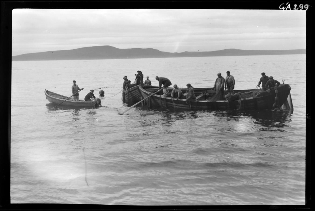 Þetta eru nótabátarnir af Garðari GK 25 frá Hafnarfirði. Maður í litlum báti t.v. er að setja belg á nótina til að létta á henni, enda stórt kast. Þetta er Sigurjón Einarsson, skipstjóri og hjá honum er Vigfús sonur hans. Þeir eru á léttabátnum af Garðari. Myndin er tekin innarlega á Húnaflóa og er Skagaströnd í baksýn. Búið að kasta.