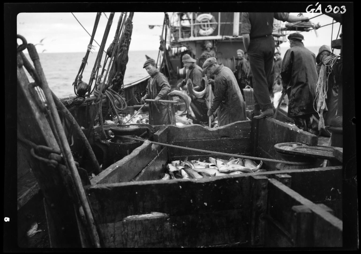 Sjómenn að störfum um borð í togara. Sjást alls 9. Menn t.v. að gogga fiskinn fram í kassa, einn við spil í baksýn. Annar gengur á kassa og er ekki á sjóklæðum. Myndin tekin aftur eftir skipinu og sést hluti af brúarvæng og brú í bakgrunni. Á vængnum er björgunarhringur og má óljóst lesa á honum VE 32.