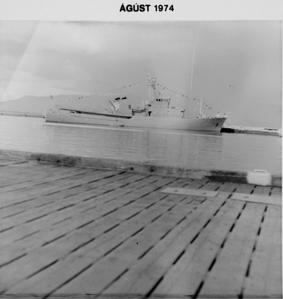 Í forgrunni er trédekk á bryggju, í baksýn liggur varðskip við bryggju. Fánalína liggur stafna á milli.