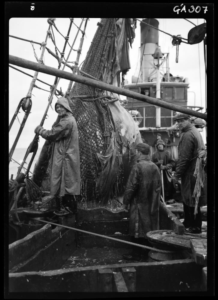 Sjómenn að störfum um borð í togara. Trollið með fiski í hangir yfir þilfarinu. Maður á sjóklæðum heldur í vant t.v. á mynd, einnig tveir aðrir í forgrunni, en í bakgrunni styður sig einn við gogg (sting), auk þess maður á bak við spil. Á dekki sjást ennfremur kassar, blakkir og vír. Myndin tekin aftur eftir skipinu og sér á hluta af brú og brúarvæng. Greina má höfuð í brúarglugga.