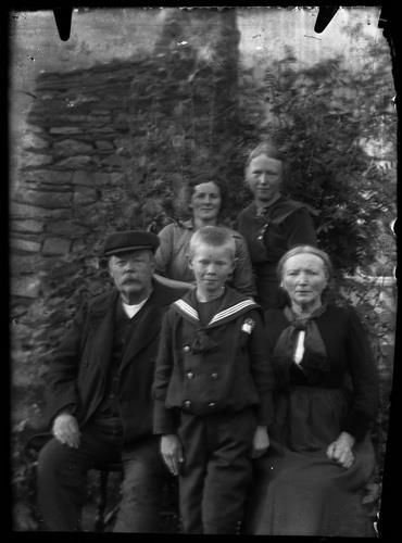 Hjón, tvær konur og drengur. Húsbændur á Skriðuklaustri. Halldór Benediktsson, Arnbjörg Sigfúsdóttir, Stefán Halldórsson á milli þeirra. Sigríður Halldórsdóttir Þormar á bak við Stefán.