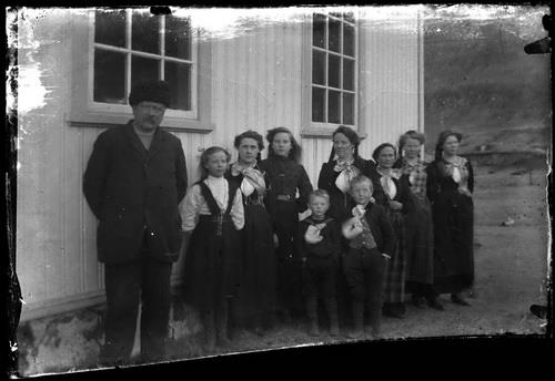 Myndin er tekin við Valþjófsstaðakirkju. Heimilisfólkið á Valþjófsstað. F.v. sr. Þórarinn, Bryndís, Jónasína Sveinsd. kaupakona, Unnur, Ragnheiður, Guðrún Jónsdóttir saumakona, Þuríður, Þórhalla fremst Stefán, Þórarinn.