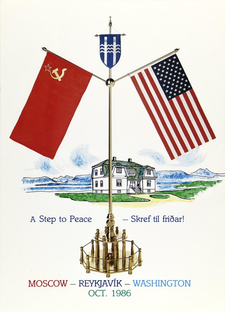 Í forgrunni er mynd af skrautlegum borðfána með fánum Sovétríkjanna og Bandaríkjanna. Í baksýn er vatnslitamynd af reisulegu timburhúsi. Undir stendur: A Step to Peace - Skref til friðar. MOSCOW - REYKJAVÍK - WASHINGTON. OCT. 1986.