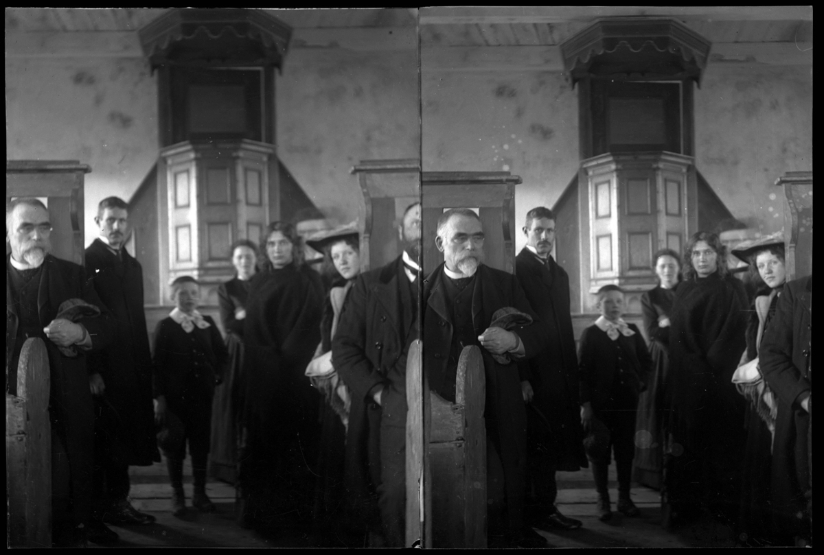 Viðeyjarkirkja. Björn Jónsson ráðherra tv., einhver Thorsteinsson systra