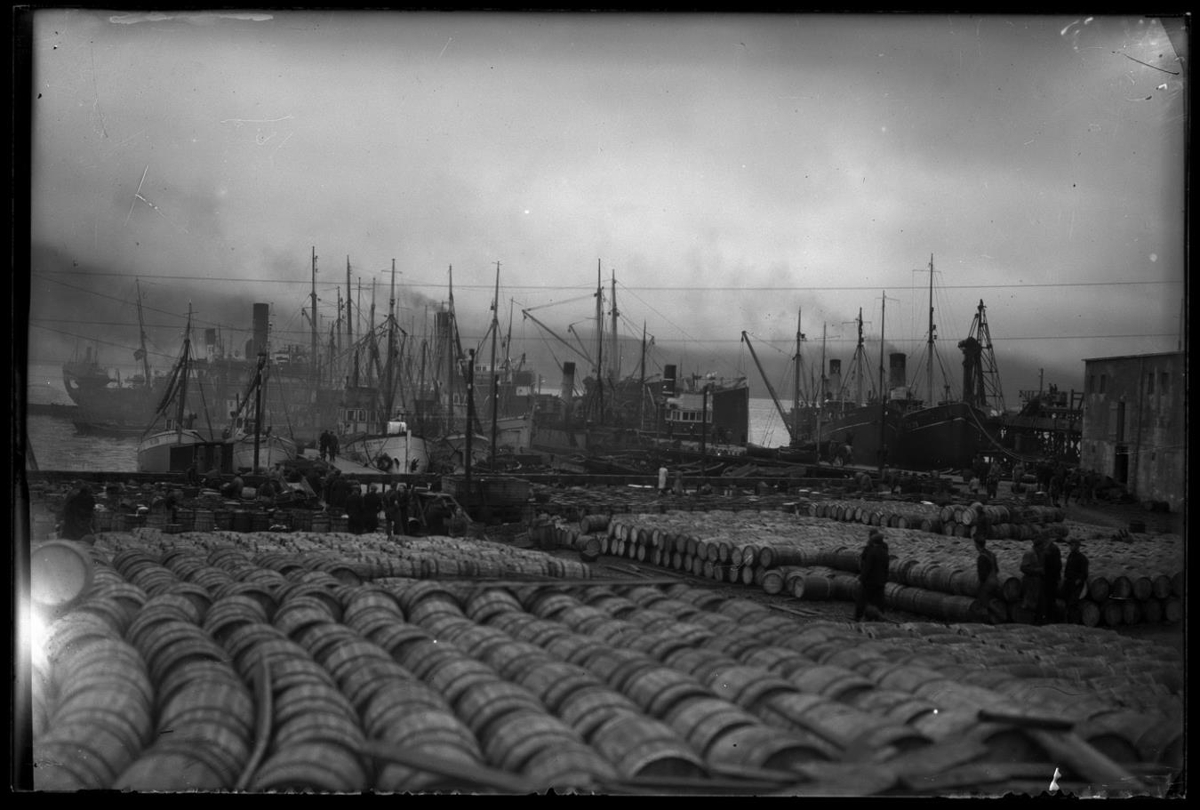 Tunnuraðir í forgrunni. Síldarplan. Fólk við söltunarstörf. Einnig hópar manna ekki að vinnu, margir á dökkum peysum og með derhúfur. Bryggjur og skip (nótabátar, fiskibátar, togara og flutningaskip). Má lesa númer á sumum: VE 316 (bátur lengst t.v.), VE..., (næstur t.h.), þá kemur RE 21. Lengst t.h., við löndundarkrana er Garðar GK 25. Utan á honum GK 4. Lengst t.h. sést horn á steinsteyptri byggingu. Þokuvafin hlíð í bakgrunni.