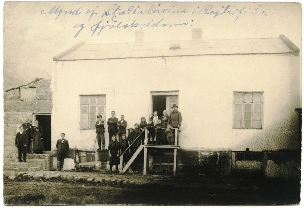 Stuðlar í Reyðarfirði. Íbúðarhúsið og heimilisfólkið fyrir utan. Nöfn þess á bakhlið myndar. Framan á myndina er skrifað: Mynd af Stuðlahúsinu í Reyðarfirði og fjölsyldunni.