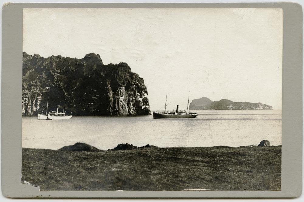 Tvö skip í innsiglingunni til Vestmannaeyjarhafnar, Ystiklettur í baksýn t.v. og Bjarnarey utar t.h.