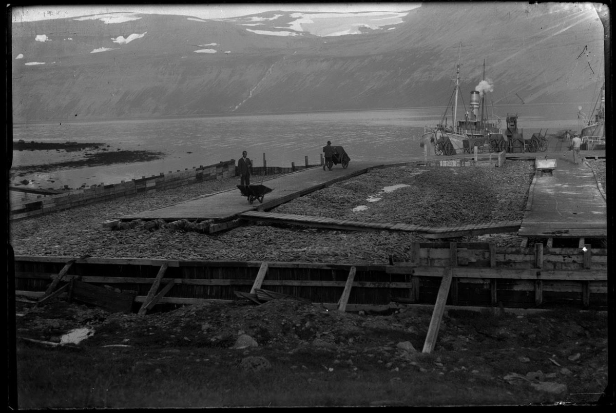 Síldarþrær fullar af síld. Á plani eða braut t.v. stendur maður á jakkafötum hjá hjólbörum, en nokkuð fjær ekur maður á jakka og með hatt handvagni á undan sér. Neðan við þrærnar, hægra megin, bryggja og við hana tveir togarar. Sá t.v. sést allur og má óljóst lesa á kinnung hans nafnið Skallagrímur. Í bakgrunni fjörður og fjall. Maður á jakkafötum er Haukur Thors framkvæmdarstjóri, en hann sá um rekstur síldarvinnslunnar á Hesteyri, en þar er myndin tekin.