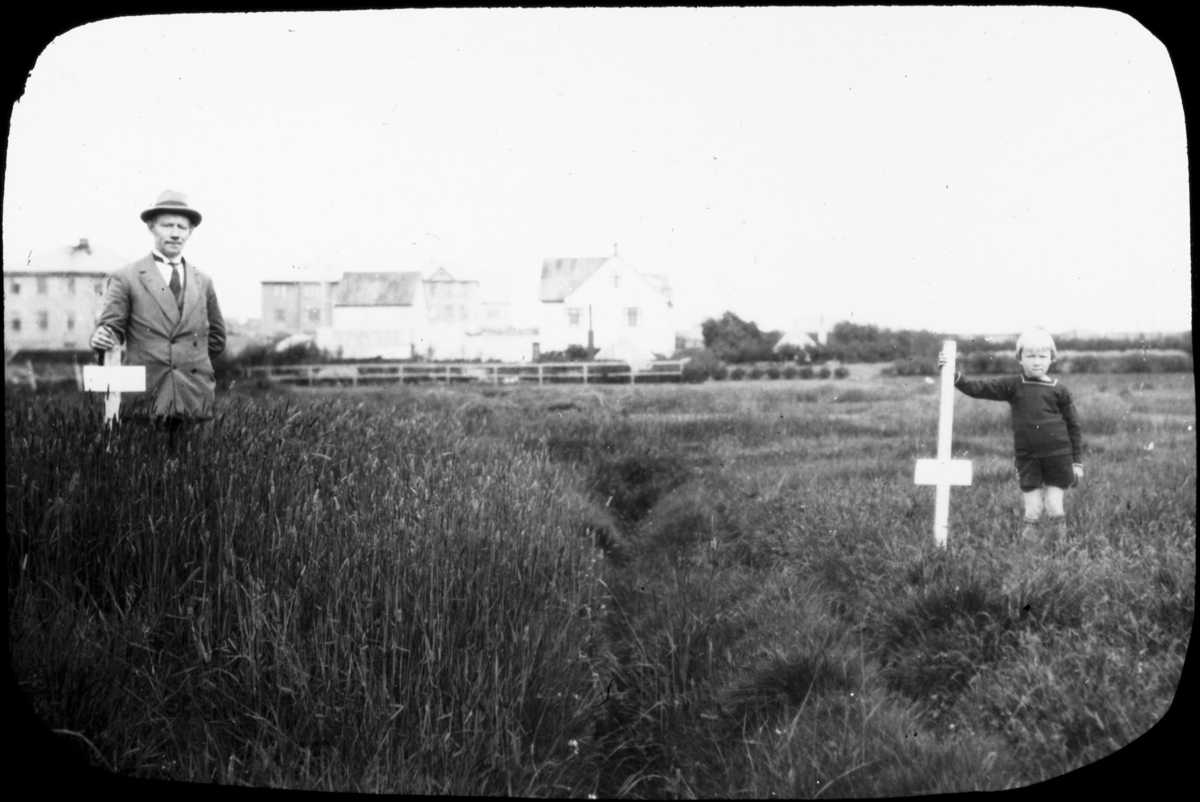11. Reykjavík. Vatnsmýrin. Maður og drengur standa við trékrossa eins konar mælistiku í tvískiptu túni og ræktunin sýnu meiri annars vegar. Fjær sjást nokkur hús. Fóðurræktartilraunir á vegum Metúsalems Stefánssonar í Gróðrastöðinni á þriðja áratugnum. Húsin í baksýn eru næst tvö hús við Gróðrastöðina og fjær nýbyggð hús við Laufásveg og hugsanlega Smáragötu. Maðurinn er Metúsalem Stefánsson ráðunautur og með honum er líklega Eirík Eylands.