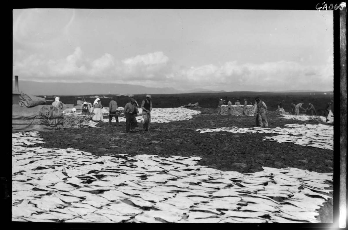 Saltfiskur útbreiddur til sólþurrkunar. Karlar og konur að vinnu. Fiskstakkar. Einn slíkur yfirbreiddur lengst t.v. Menn með börur á milli sín, annar þeirra á dökku vesti, hinn á dökkum buxum og með axlabönd. Báðir með derhúfur. Hraun í bakgrunni og fjöll. Sér á húsaþök t.v.