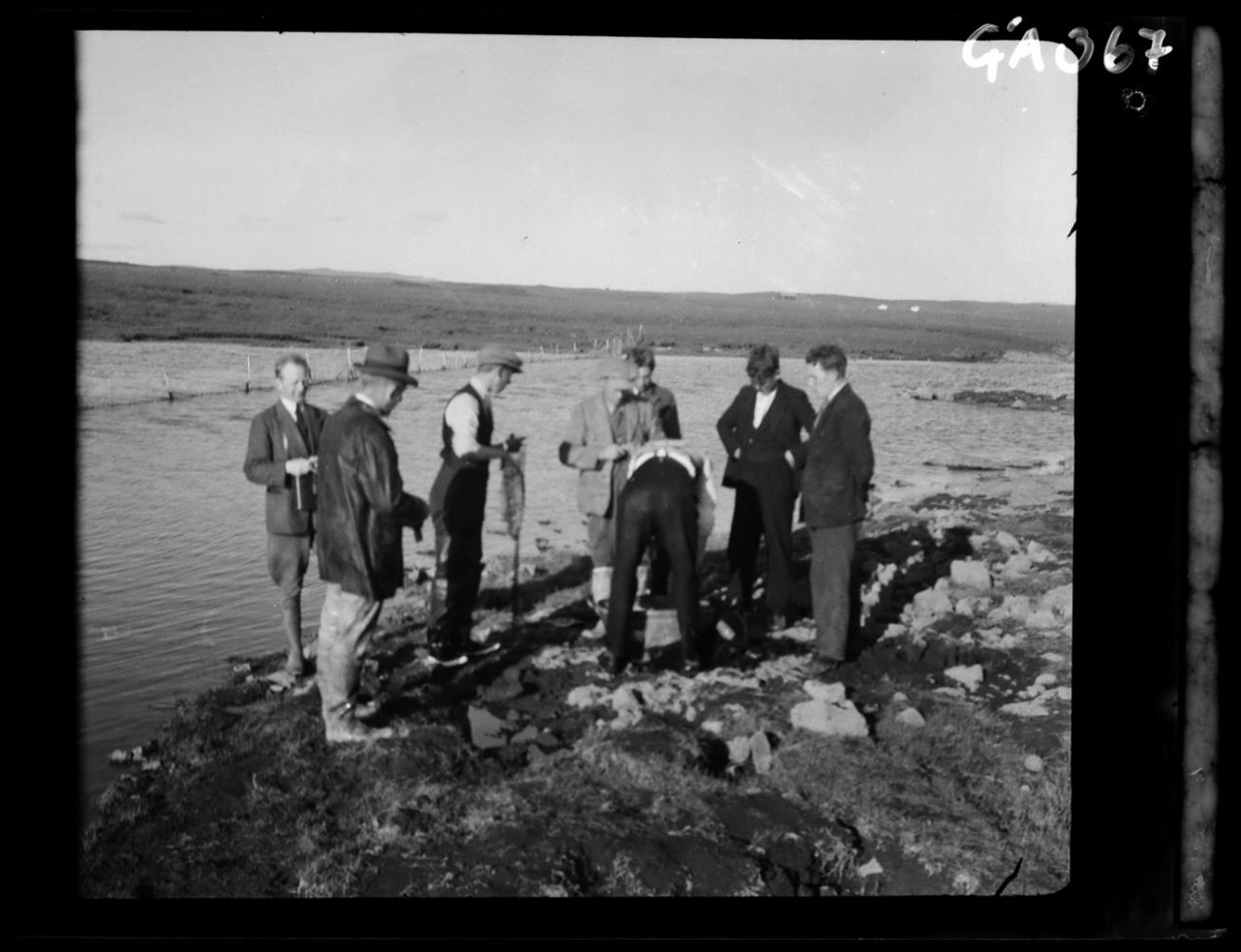 Átta menn standa saman í hnapp á árbakka. Einn heldur á fiski, sennilega í háfi. Klæðnaður: stakir jakkar og buxur. Tveir með derhúfur og einn með hatt. Bússur, stígvél. Girðing liggur út í ána. Á hinum bakkanum sjást tvö hús í mikilli fjarlægð.
