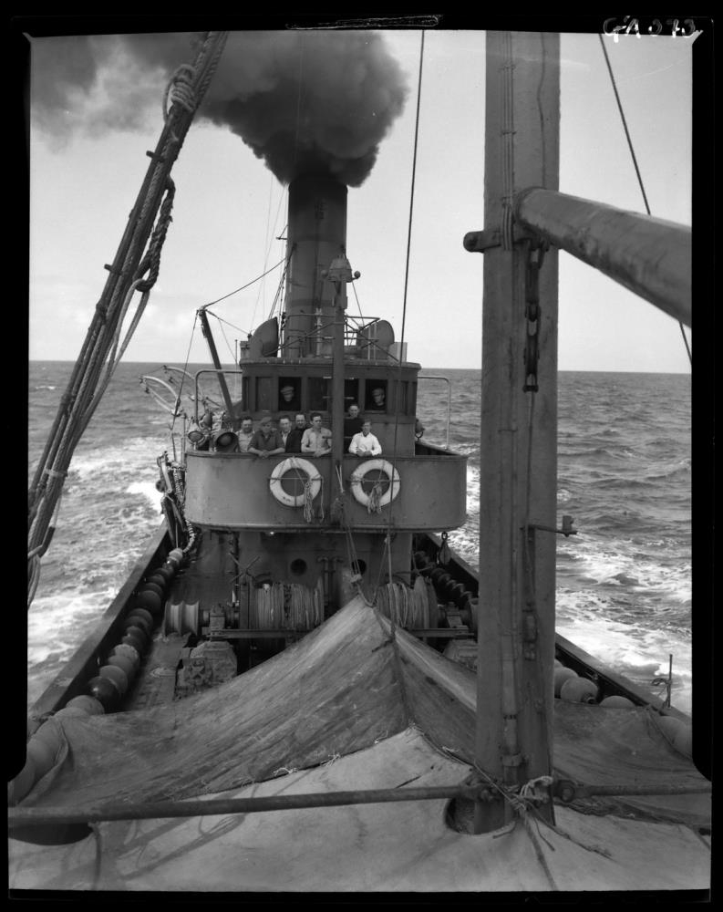 Tekið á siglingu til Englands með farm af ísfiski. Segl breitt yfir dekkið til að verja fiskinn fyrir sólarhita.