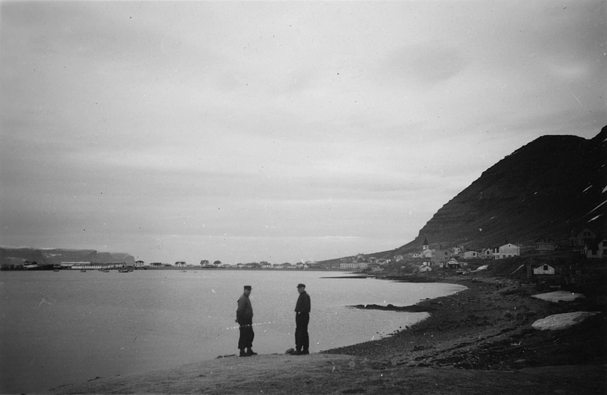 Tveir karlmenn á hæð. Þorpið Patreksfjörður á Vatneyri í baksýn.
