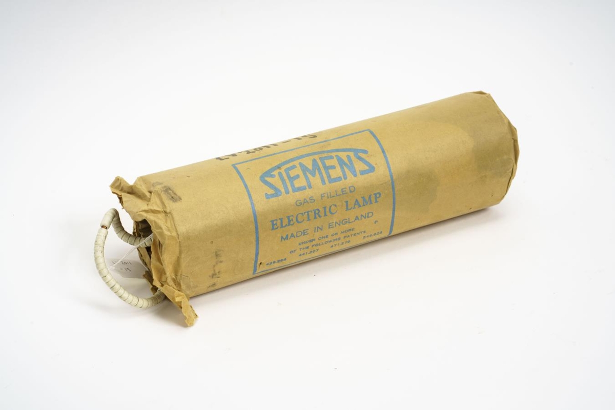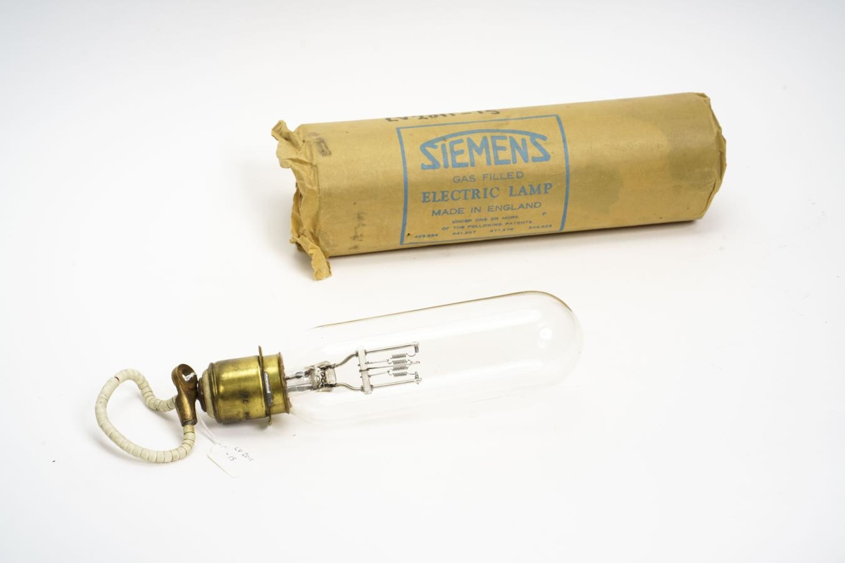 Gasfyllt ljósapera frá Siemens úr Varastöðinni í Elliðaárdal.