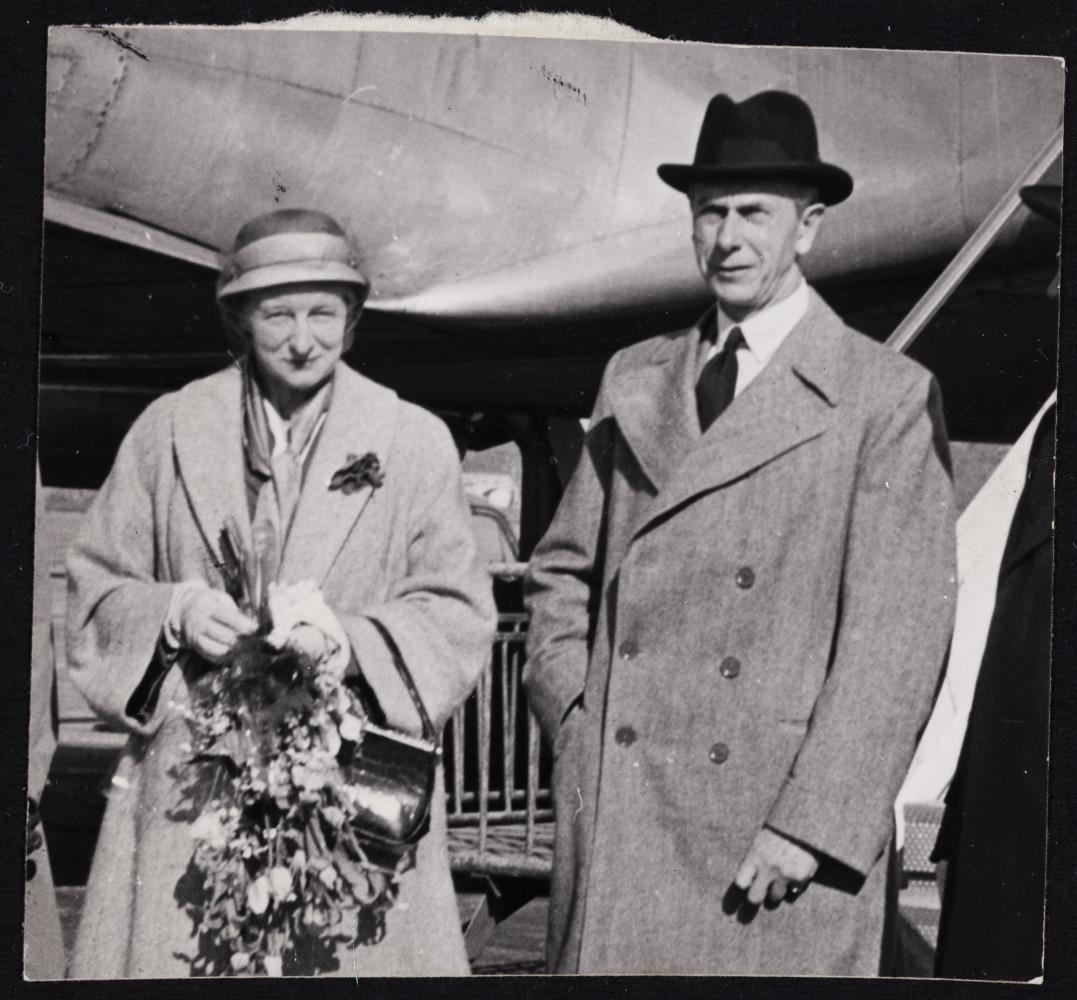 þessi mynd af hjónunum tekin við komu þeirra. Á vellinum tóku á móti þeim
