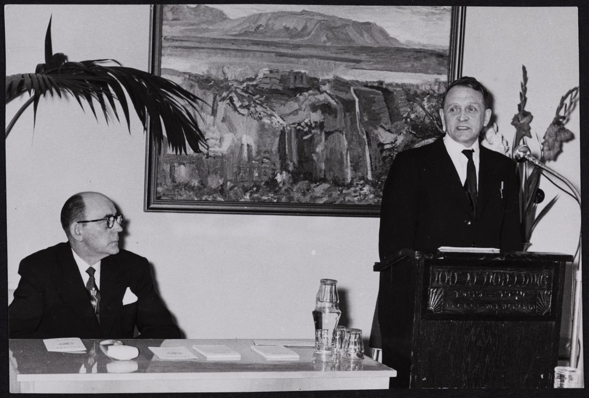 borð, en hinn stendur við ræðupúlt. Á bakvið hann er landslagsmálverk.