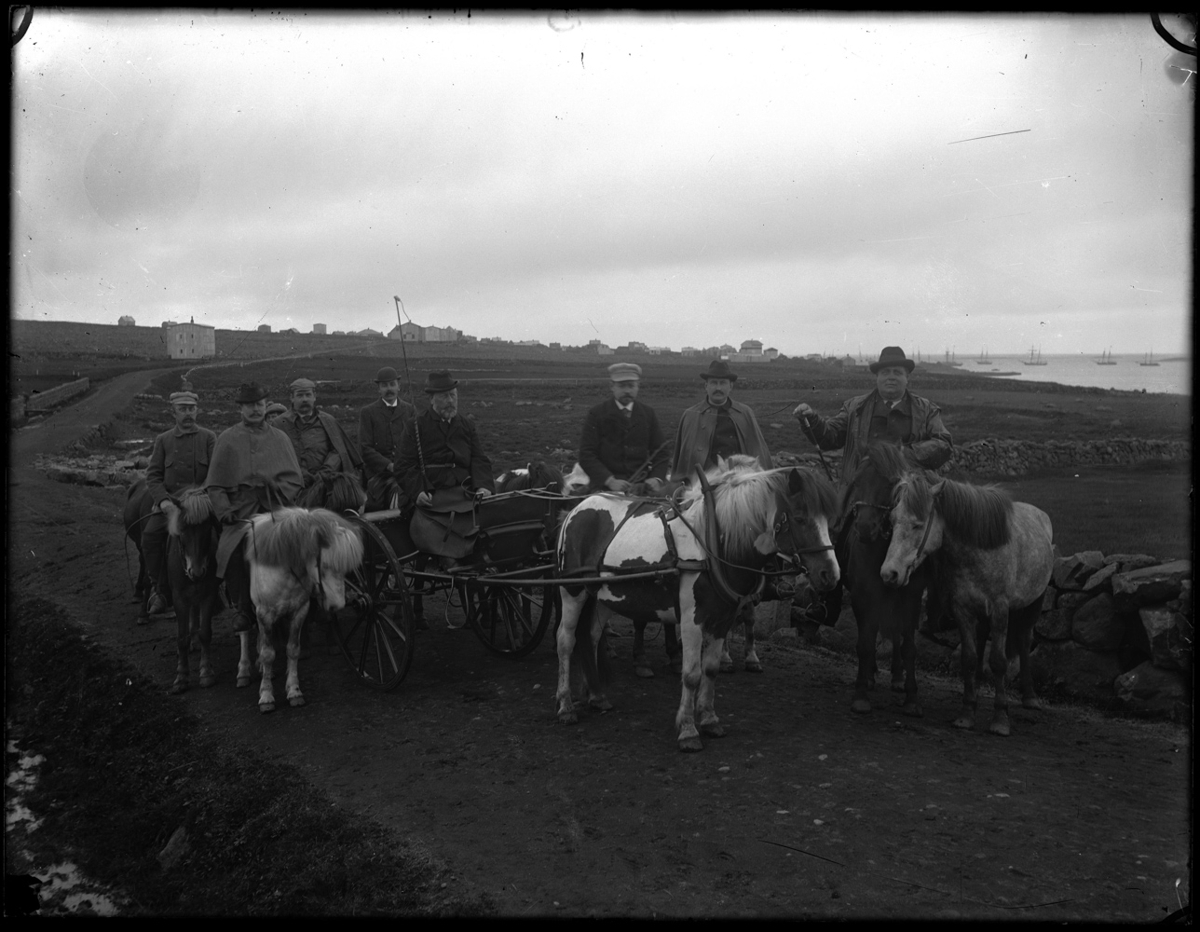Sjö menn á hestum og einn í hestakerru á skemmtiferði. Mennirnir eru allir með höfuðföt og vel búnir. Þekkja má Lárus H. Bjarnason annan frá vinstri og Árna Thorsteinsson í kerru. Ludvig Hansen kaupmaður lengst til hægri. Í útreiðartúr við Rauðará. Í fjarksa má sjá hús efst við Laugaveg. (Sjá bók SEY nr. 37).