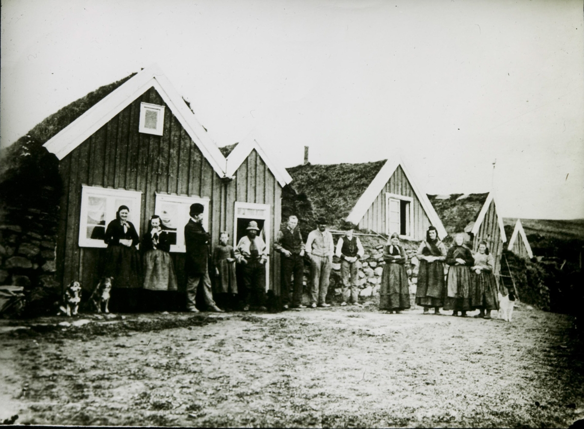 36. Haukagil í Hvítársíðu. Heimilisfólk stendur ásamt þremur hundum framan við fimm bursta torfbæ. Íslenskur bóndabr er skrifað á skyggnuna. Ljósmyndari Sigfús Eymundsson. Um 1890.