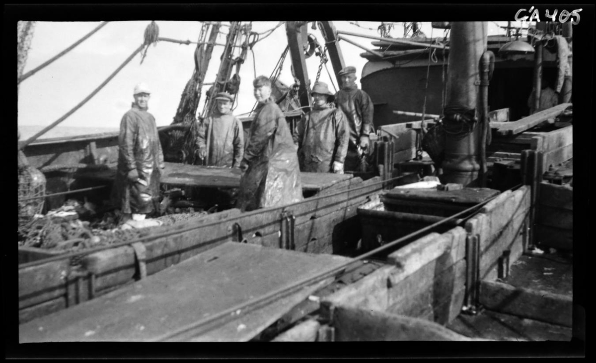 Fiskaðgerð um borð í togara. Sér á þilfarið einkum bakborðsmegin. Fjórir sjóklæddir menn og einn unglingur. Flatningsborð. Hólfað þilfar (kassar). Fremur óskýr mynd.