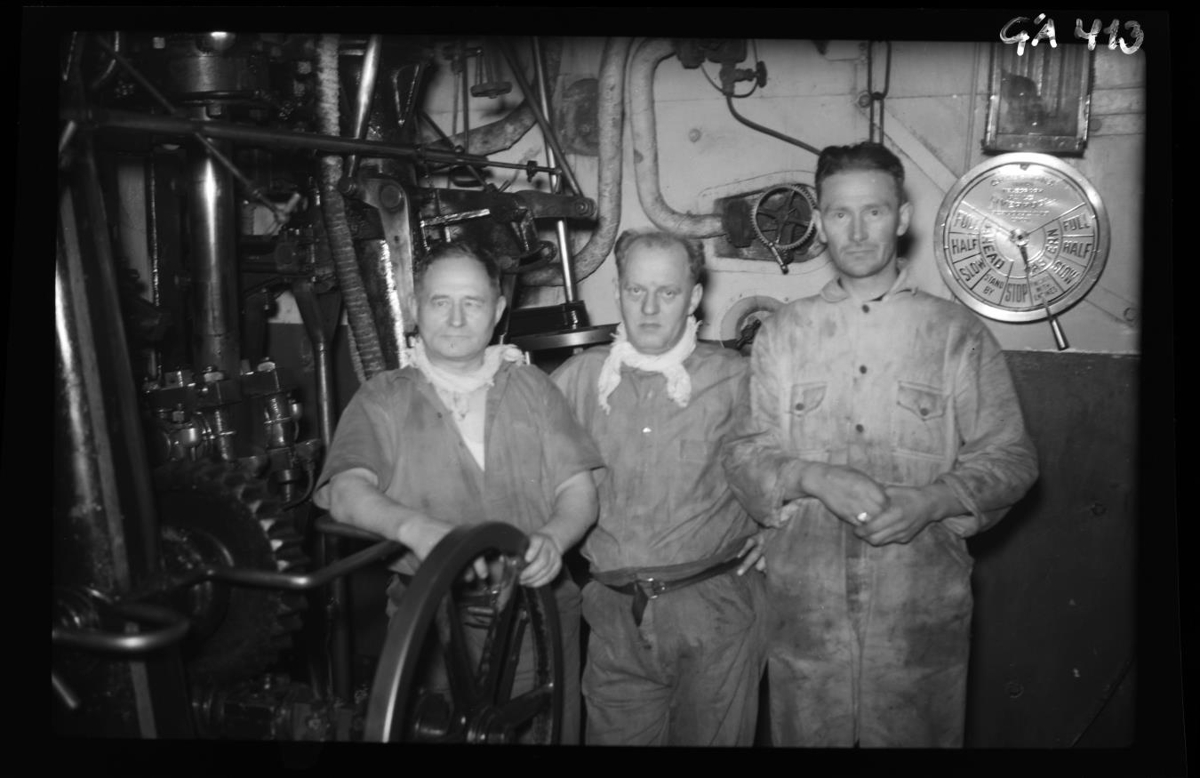 Í vélarrúmi skips. Þrír menn saman í hnapp. Tveir klæddir skyrtum og með klút um hálsinn, á buxum og með belti. Lengst til hægri maður á samfestingi. Vélin vinstra megin, en ketillinn í bakgrunni. Á honum sést "telegrafinn", hringlaga með enskum orðum á.