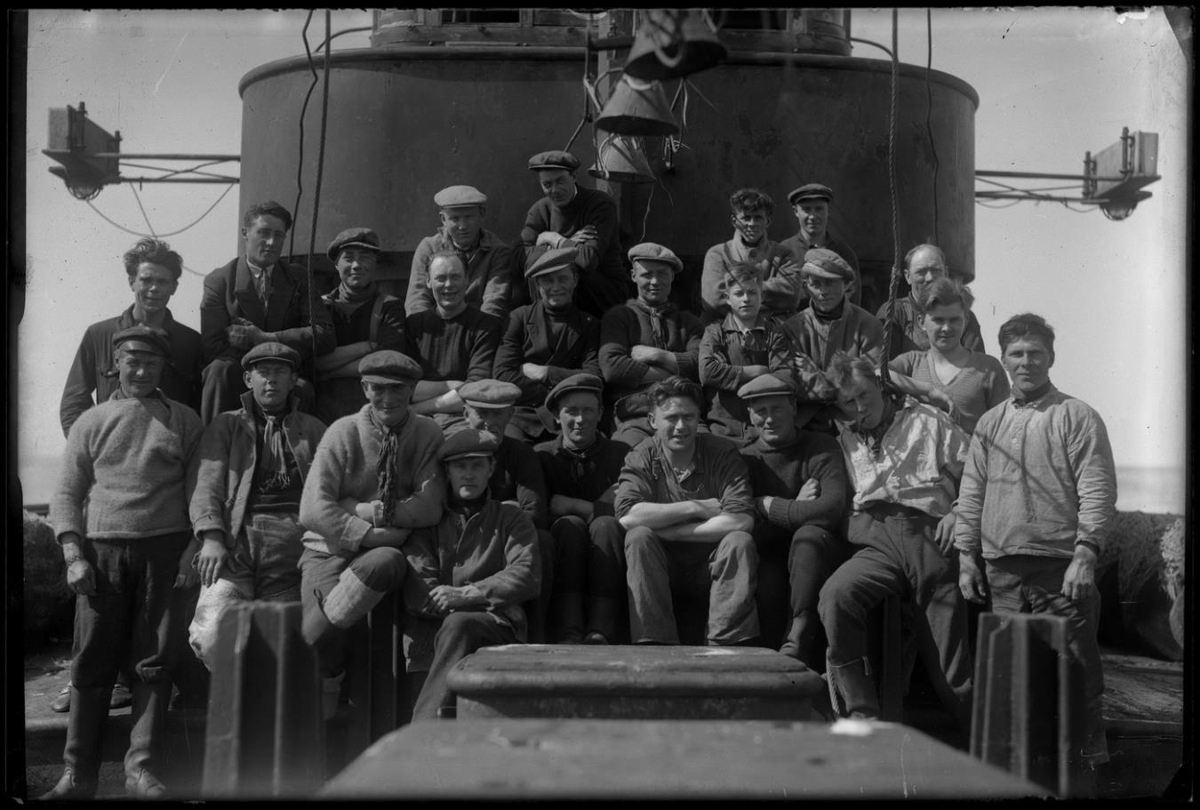 Hópur manna, skipsáhöfn, stendur og situr á þilfari skips framan við brúna. Klæðnaður: Peysur, jakkar, búllur, kaskeyti, derhúfur, stígvél, treflar, bindi, samfestingar, smekkbuxur. Lanternur skaga á örmum út frá brú. Vinnuljós hanga framan við hana miðja.