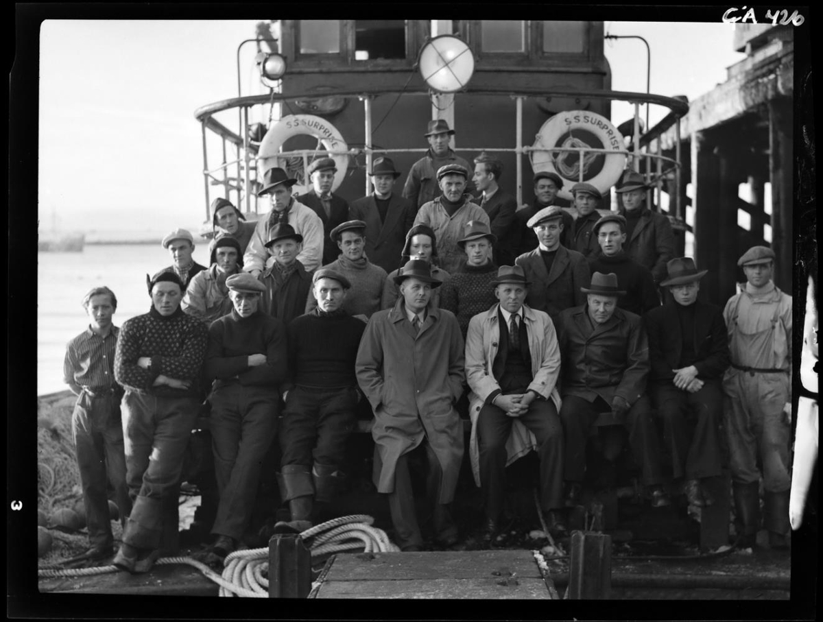 Hópur manna stendur og situr framan við brú um borð í skipi. Á brúarvæng, sem er rekkverk, sitt til hvorrar handar, eru tveir björgunarhringir. Á þeim má lesa "S.S. SURPRISE". Þrír menn í fremstu röð eru klæddir frökkum, jakkafötum og með bindi. Við hlið þeirra maður á jakkafötum og með bindi. Við hlið þeirra maður á jakkafötum og með hatt eins og hinir þrír. Klæðnaður annarra: Peysur, buxur, jakkar, smekkbuxur, samfestingur, skór, bússur, derhúfur og hattar. Til hægri sést á bryggju og er lágsjávað.