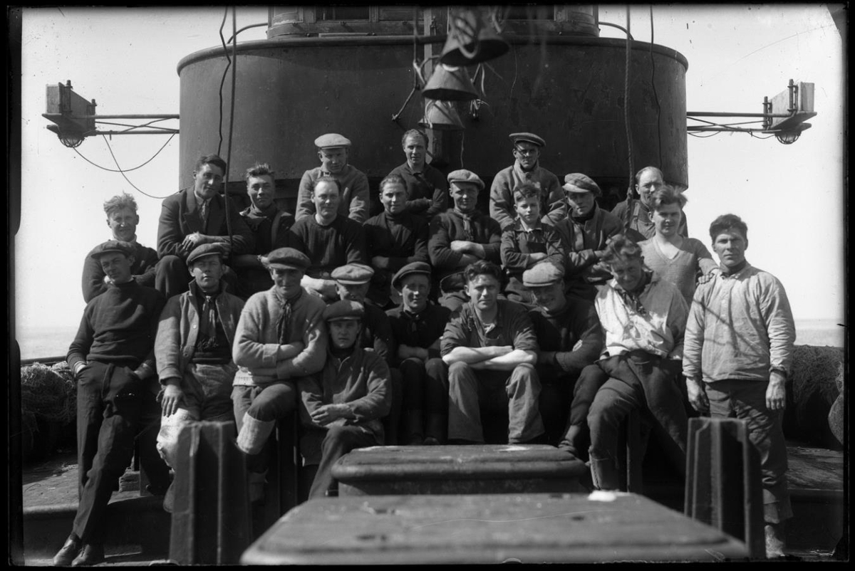 Hópur manna - skipshöfn - standandi og sitjandi um borð í skipi framan við brúarvænginn. Út frá honum skaga lanternur á armi, en vinnuljós hanga framan við hann miðjan. Í forgrunni lestarop (lokuð). Klæðnaður: Peysur, jakkar, búllur, buxur, smekkbuxur, jakkaföt, bindi, treflar, derhúfur, stígvél, skór.