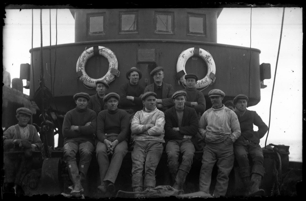 Hópur manna situr á spili framan við brú um borð í skipi. Tveir björgunarhringir framan á brúarvæng, en á þeim má lesa "Víðir - Hafnarfjörður". Lengst t.v. sér á trébryggju. Klæðnaður mannanna: Peysur, búllur, jakkar, lokubuxur, jakkar, stígvél, bússur og derhúfur.