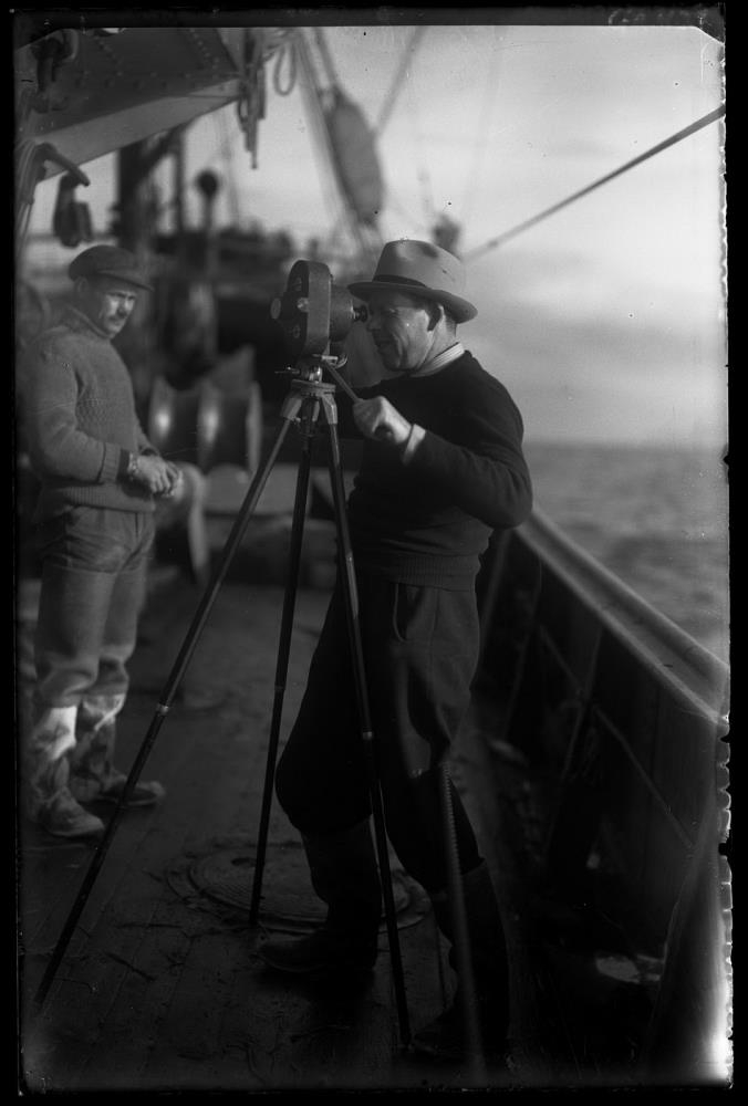 Kvikmyndataka um borð í togara. T.h. á mynd er maður með ljósan hatt, í stígvélum og dökkri peysu og buxum. Horfir inní kvikmyndatökuvél sem stendur á þrífæti. Heldur um handfang áfast þrífæti. T.v sjómaður í klofbússum, peysu og með húfu. Virðist halda einhverju í höndum sér (tóbakspontu?). Um úlnlið hans armband. Sést á skipið stjórnborðsmegin frá brúarvæng og fram á hvalbak. Bakgrunnur óskýr.