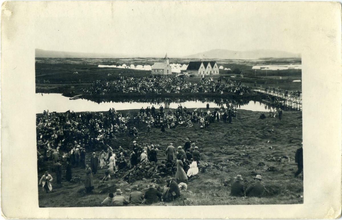Alþingishátíðin 1930 á Þingvöllum. Fólksfjöldi sést sinhvoru megin við ána. Í baksýn er Þingvallabærinn og kirkjan. Tjöld þar fyrir aftan. Stimpill ljósmyndara á bakhlið.