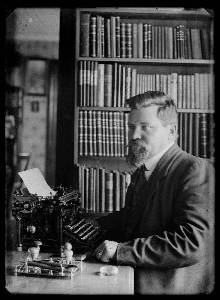 Hafnarfirði. Maður situr við skrifborð sem á er ritvél og blekpress, pennastatíf