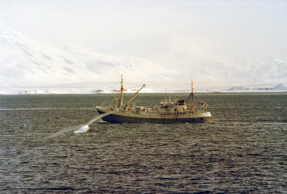 á siglingu. Í baksýn er snævi hulið fjall og láglendi.