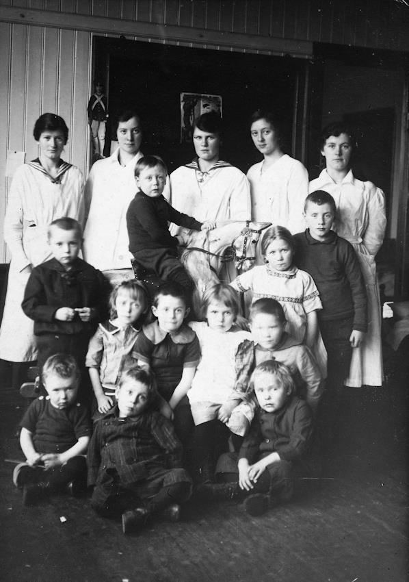 5 samstæð póstkort frá barnaspítalanum í Miðbæjarskólanum í spönsku veikinni. Nöfn starfsfólks aftan á mynd. Sigríður Björnsdóttir Blöndal, læknis; Jóhanna Vilhelmsdóttir Knudsen hjúkrunarkona; Sigríður Briem Thorsteinsson; Guðrún Árnadóttir (Johnsen) frá Geitaskarði; Kristín Björnsdóttir Arnas. kona Gunnars Halldórssonar Jónssonar bankastjóra.