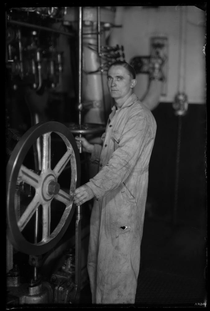 Í vélarrúmi skips. Berhöfðaður maður klæddur samfestingi stendur við vélina. Heldur annarri hendi í stöng, framan við stórt hjól, en hinni í sveif á minna hjóli. Á bakvið sér á gufuketil skipsins.