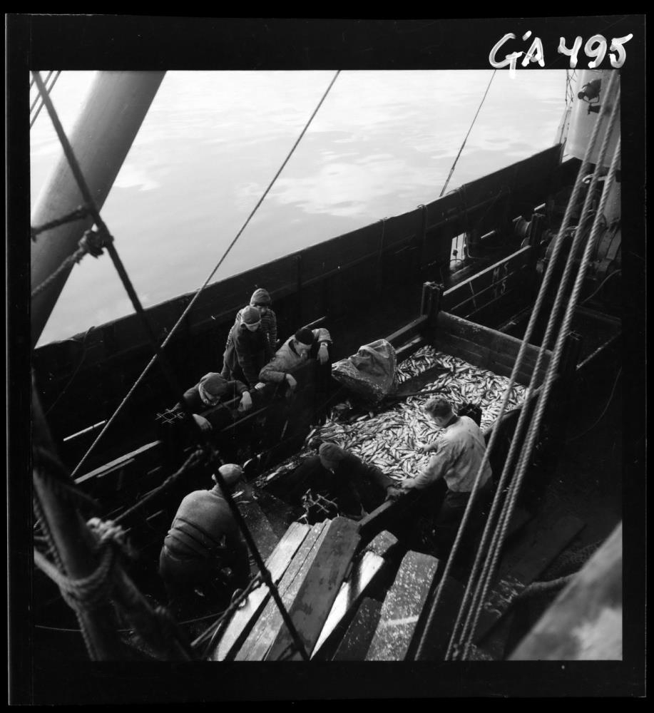 Sér niður á þilfar skips. Hólfað dekk (kassar), síld í kassa. Vinnuklæddir menn og tveir drengir umhverfis. Maður að fara niður um lestarop.