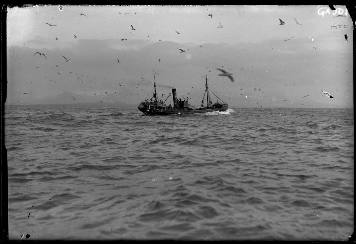 Togari á siglingu. Á honum má lesa hluta af skráningarnúmeri: "RE 27..." Fuglar á flugi. Fjöll í móðu í bakgrunni.