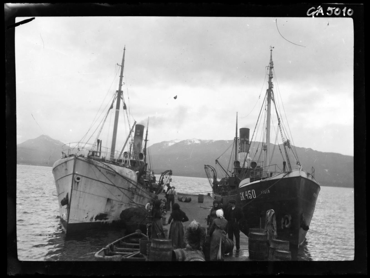 Togararnir Njörður RE 36 og Víðir GK 450 sitt hvoru megin við litla bryggju. Á henni eru konur og karlar og nokkrar síldartunnur. Nótabátur eða - bátar við bryggjuna vinstra megin. Fjöll í baksýn.