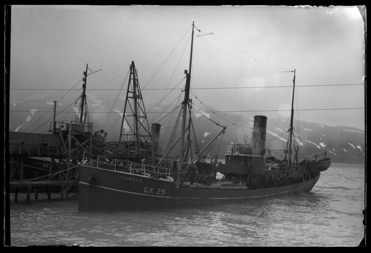 Toprgararnir Garðar GK 25 og Ólafur RE við síldarlöndunarbryggju. Síldarlöndunarplan. Fjall í baksýn.