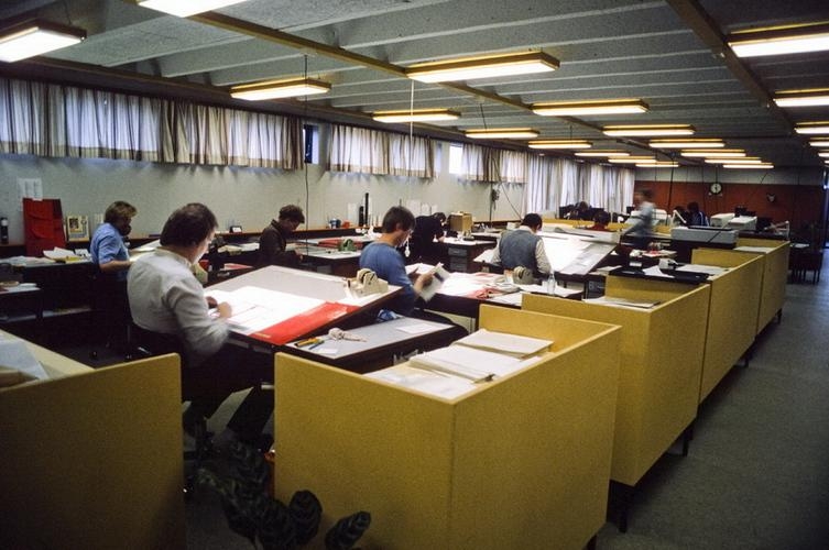 prentverksmiðju. Bókastaflar-blaðabunkar-vélasamstæður-fólk við vinnu