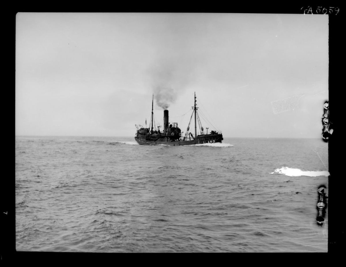 Togarinn GK .... 345 á siglingu. Skipið er þjóðernisauðkennt ( með fána og landsheiti).