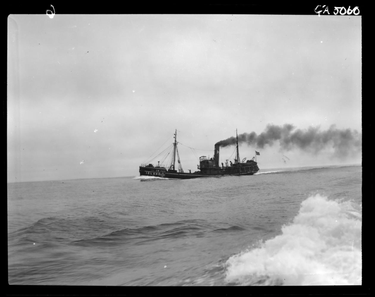 Togarinn Júní GK 345 á siglingu. Þjóðernisauðkenndur með fána og landsheiti (á kinnung og brú). Ísl. fáninn við hún á stöng aftast á skipinu.