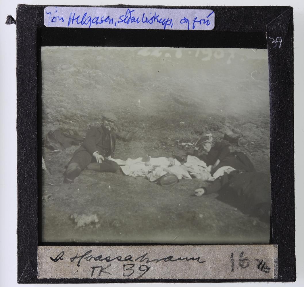 sín. Maðurinn er með vindil. Jón Helgason biskup og kona hans. Konan sem