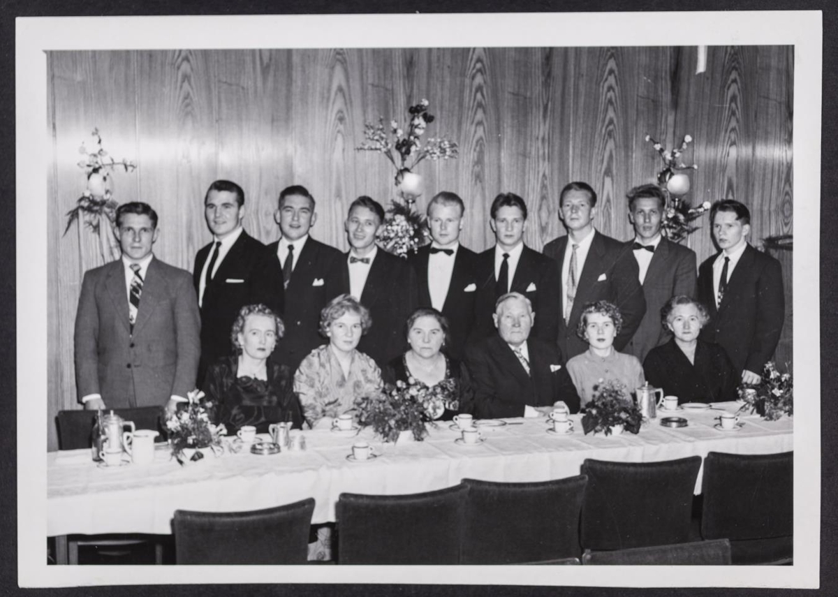 Uppstillt mynd. Við langborð sitja fimm konur og einn karlmaður í eldri kantinum. Aftan við þau standa níu ungir karlmenn, sumir með bindi en aðrir með þverslaufur. Á borðinu eru kaffibollar. Myndatexti er „Mynd þessi var tekin í afmælishófi Arngríms Fr. Bjarnasonar er börn hans héldu honum fyrir tveim dögum, en í dag er Arngrímur sjötugur. Á myndinni er kona Arngríms, Ásta Eggertsdóttir og 14 af börnum hans, en fjögur voru fjarverandi.“ Fyrirsögn greinar er „Sjötugur: Arngrímur Fr. Bjarnason fyrrverandi ritstjóri“.