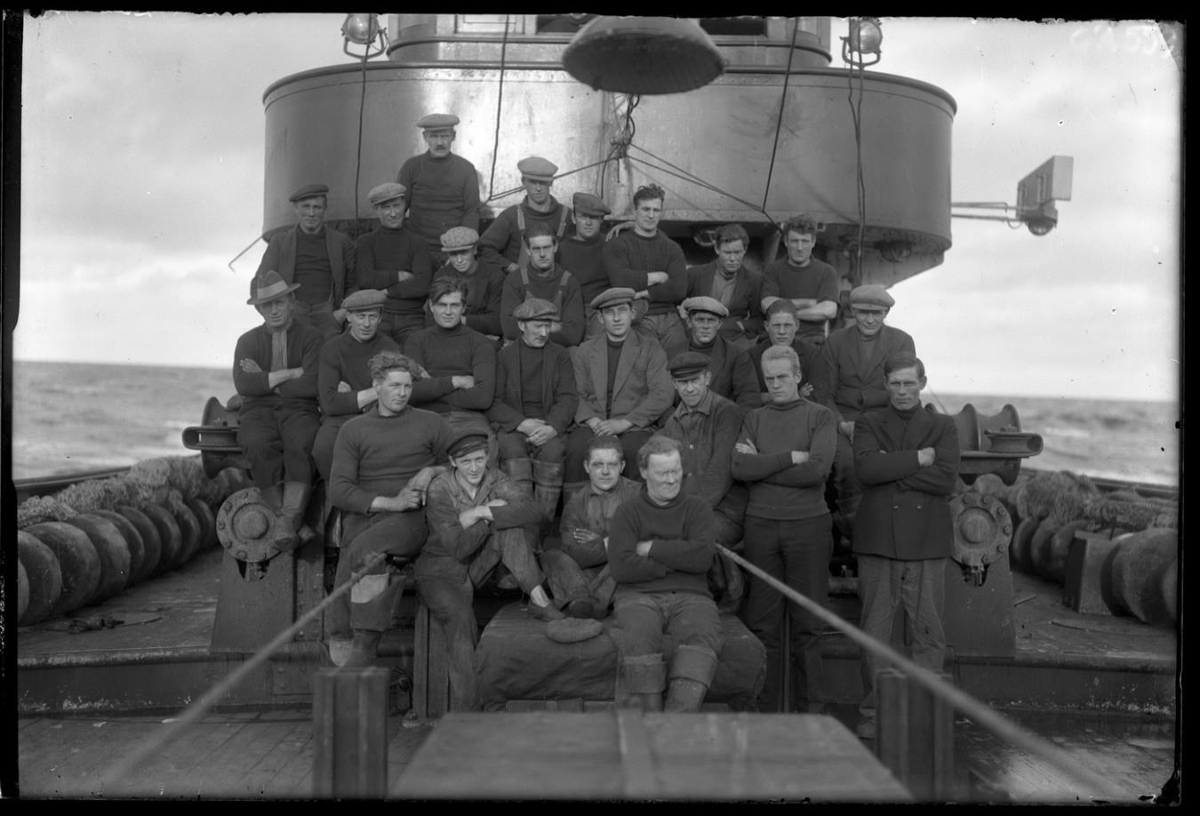 Hópur manna framan við brú um borð í togara á siglingu. Sumir sitja, aðrir standa. Bobbingar við borðstokka. Klæðnaður mannanna: Peysur, jakkar, samfestingur, buxur, derhúfur, kaskeyti, bússur, stígvél, skór, hattur.